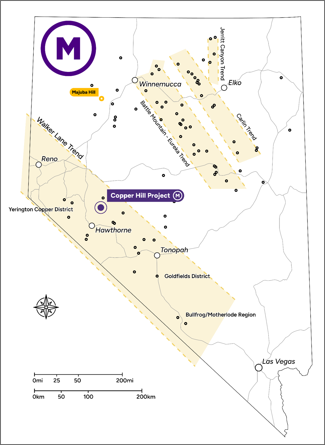 Located within the prolific Walker Lane trend in southern Nevada, Copper Hill is situated one of the premier jurisdictions for precious metals mining in the world. Historic endowment within Walker Lane includes 50Moz Au, 700Moz Ag, and 4Mt Cu. Copper Hill hosts copper-gold-molybdenum mineralization in both porphyry and skarn styled deposits in Mineral County, Nevada.